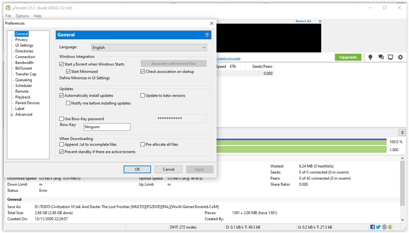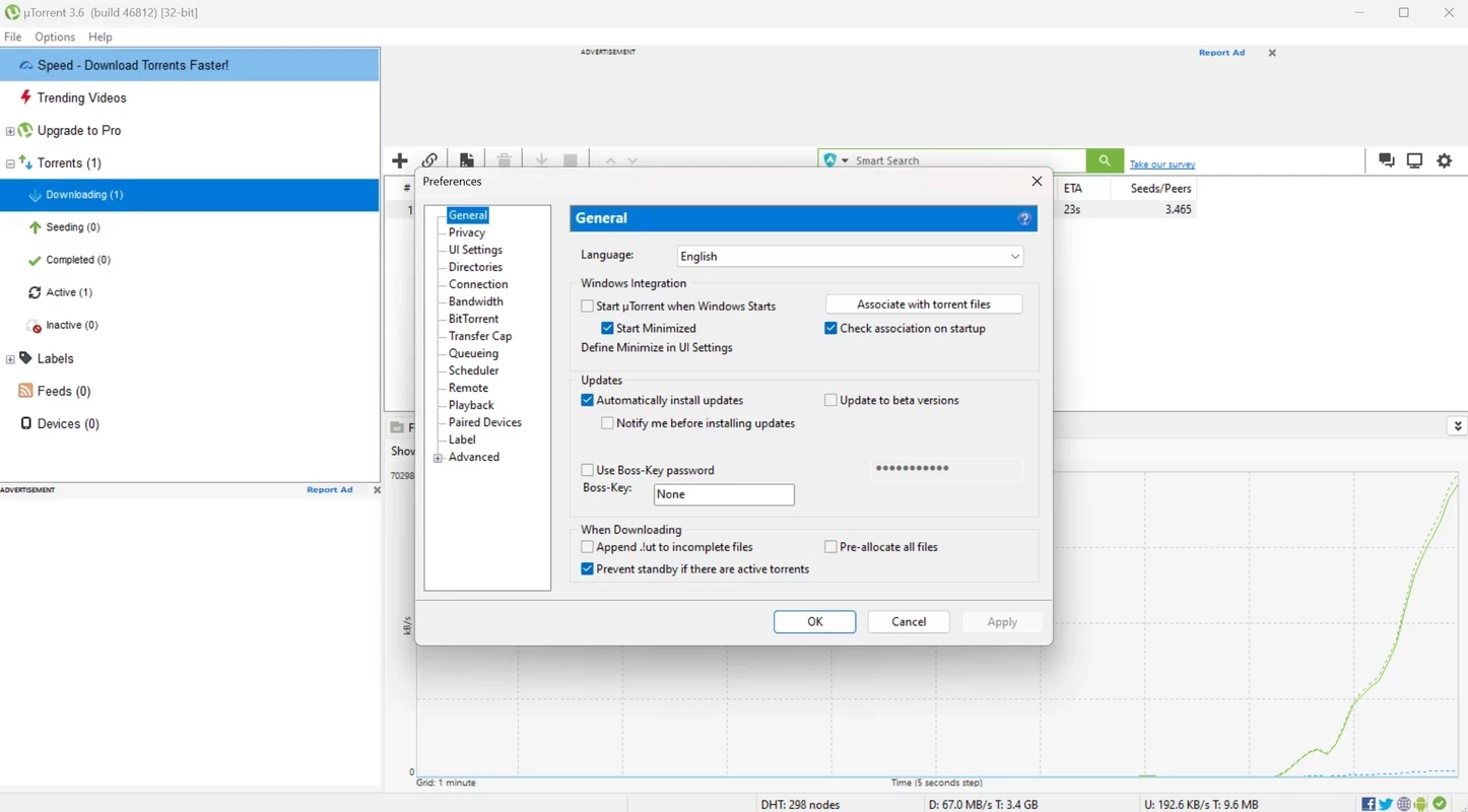 You can enhance the functionality of the program via the Options section. It includes a list of options that allow you to modify several tasks such as configuring your interface and changing the look of the screen. Keep in mind; that it requires a little technical skill if you want to modify the advanced settings option. On the interface, an advanced tab is available for making the changes on uTorrent.